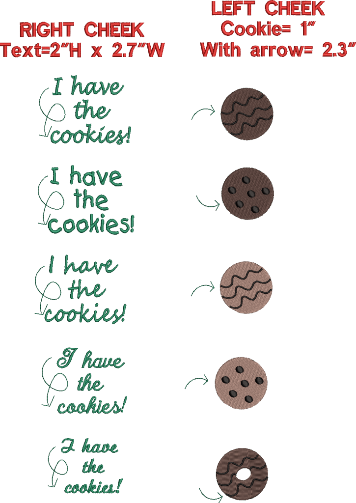 3. Digitize the design. Since I have hundreds of embroidery fonts and I enjoy digitizing, I decided to create her design from scratch. I used my embroidery digitizing software and came up with five (5) options for her. Five different fonts and five different cookies.