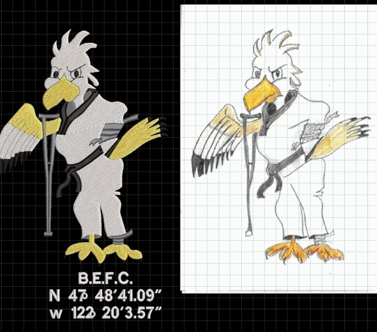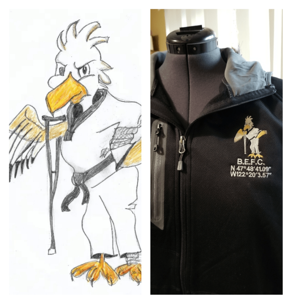 We just finished a custom project for a customer. She has a talent for drawing and is passionate about martial arts. She drew a beautiful and intricate “B.E.F.C.” logo and asked if I can embroider it on a few items: a tote bag, several sun visors, and three different brands of jackets. The “package” was going to be presented to a very good friend, her B.E.F.C. co-founder for her 50th birthday.